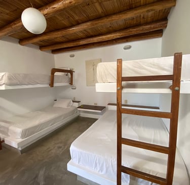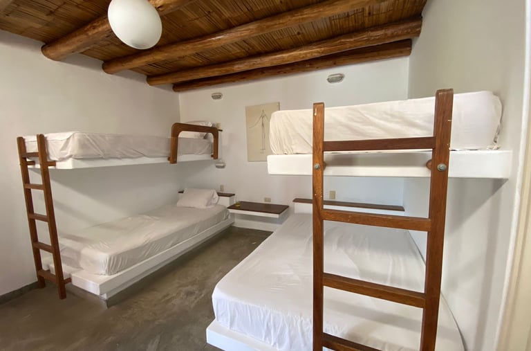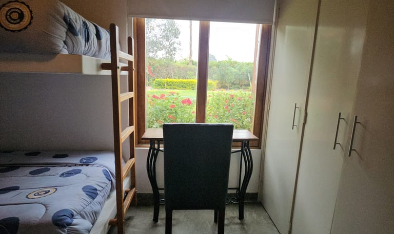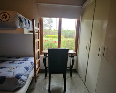 Dormitorio con 2 camarotes para 4 personas y un pequeño estudio para trabajar , con un ropero empotrado y sus servicios higiénicos compartidos.